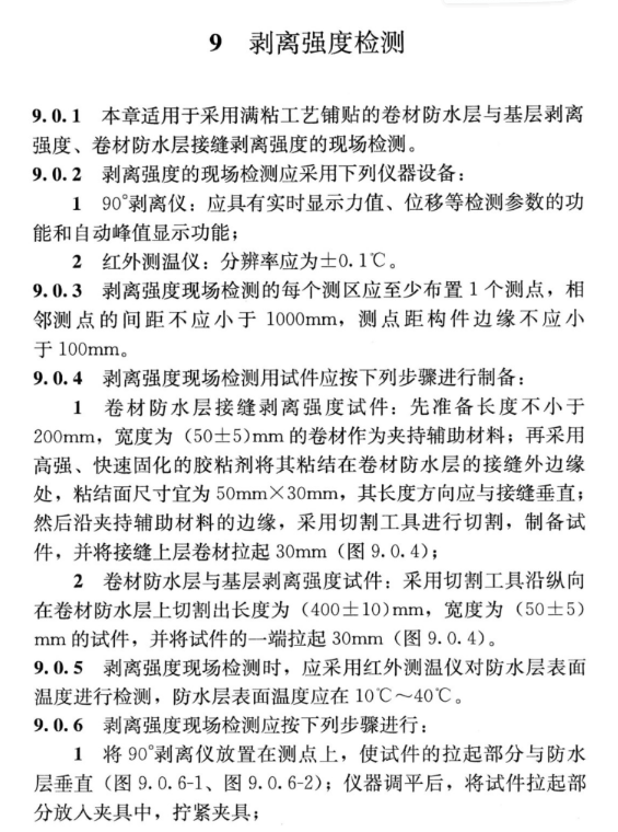 剝離強度現(xiàn)場檢測時,應采用紅外測溫儀對防水層表面溫度進行檢測,防水層表面溫度應在10~40度